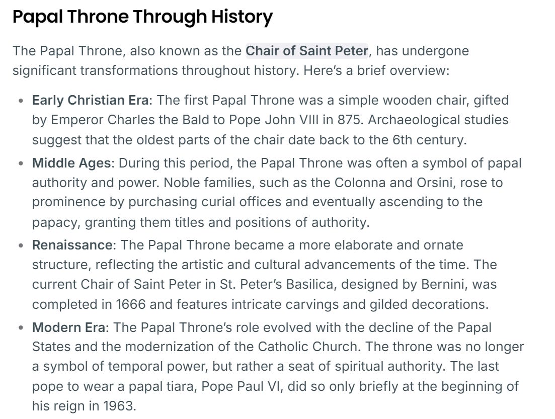 If anyone has more historical details to offer me in this study that would be greatly appreciated. I believe the general facts presented here are truthful, but am quite happy to be corrected. the following is a screen shot from a Google search for “Chair of Saint Peter. The facts are presented quite truthfully from a disinterested view. And for an AI production, the summary does a subtle job of blurring the difference between the physical Chair and its authority.