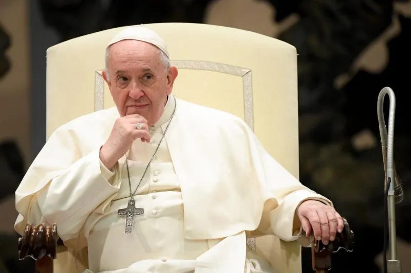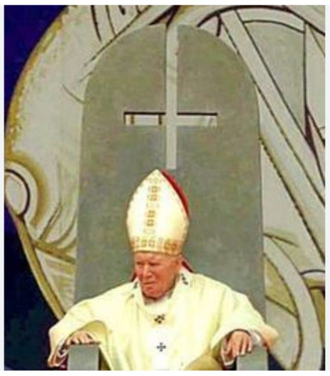 This throne below with John Paul 2 on it is telling of a total sense of liberty from the material throne entirely in assumption of its ecclesiological intention. To say this ‘Chair’ is just another like the bland one above, not the Cathedra, but a Cathedra is to be blind from the significance of symbols. The throne is grand if minimal. I am curious on what occasions JP2 used this chair, as said above, he can be found in the same chair Francis is sitting, yet for some, or at least one time he sat in this bespoke Chair to indicate his authority, to draw attention to himself for a particular purpose. The image is menacing to pious eyes. The inverted cross has been the cause of much speculation. As St Peter was hung on an inverted cross by his own request, there is an orthodox meaning. Still, the inversion is also a satanic symbol, as this ‘religion’ is nothing more than an inversion of Christianity. The devil is not a creator but a destroyer.