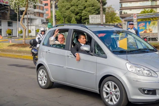 Irony is the rule of the day, for what better symbol against the excesses of industrial society that Francis rails against, than to be carried about by immediate human power, in an aesthetic context far from the industrial utility of the ‘Pope Buggy’ above. But such a servile social relation of men carrying a superior is anathema to social democratic sensibilities. It is not that the Pope Mobile was new, as a secular history in Hot Cars makes clear (Ha ha). It is not so much that the Pope Mobile replaced the older processional chair, but rather that the two vehicles were combined for a single purpose. Leaving the pope free to tool about in this humble ride, fit only for an uncrowned king. But I get ahead of myself. Let’s get back to the papal cathedra on tera firma.