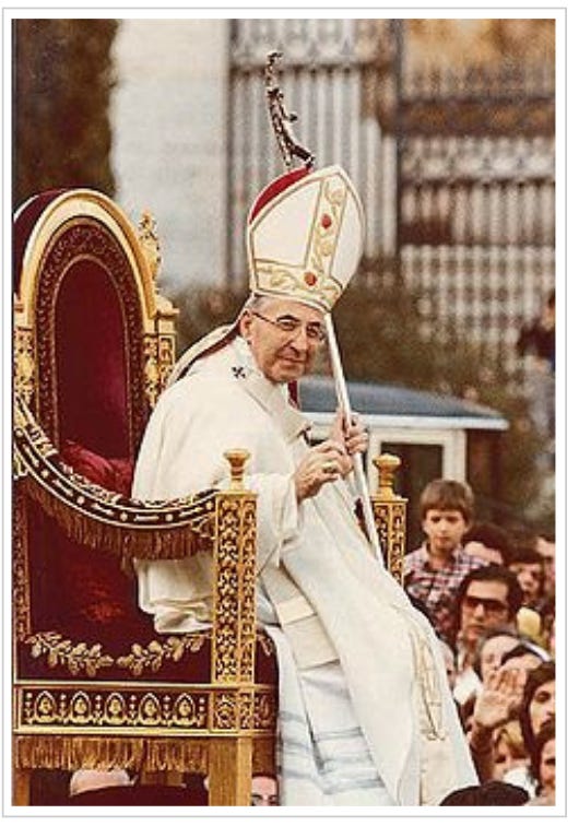 As an informative introductory aside we know that no pope has used the traditional sedia gestatoria for processing, since John Paul 1. And by the search result for the image below, he last used it the day of the night he died. Not sure if this detail is mentioned in the conspiracy lore, but the act of using the sedia gestatoria seems a reactionary gesture against its replacement under JP 2, his modified “Pope Mobile”, transport fit only for a tin-pot dictator. If murdered, and this must remain a possibility, perhaps the short reigned John Paul was too much a romantic for this stage of the revolt'? The sedia gestatoria certainly does look out of place against the brutalist backdrop of the Novus Ordo ecclesial aesthetic.